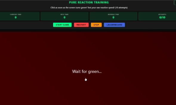 Test your raw reaction speed by clicking as soon as the screen turns green. A simple but challenging test of pure reaction time.